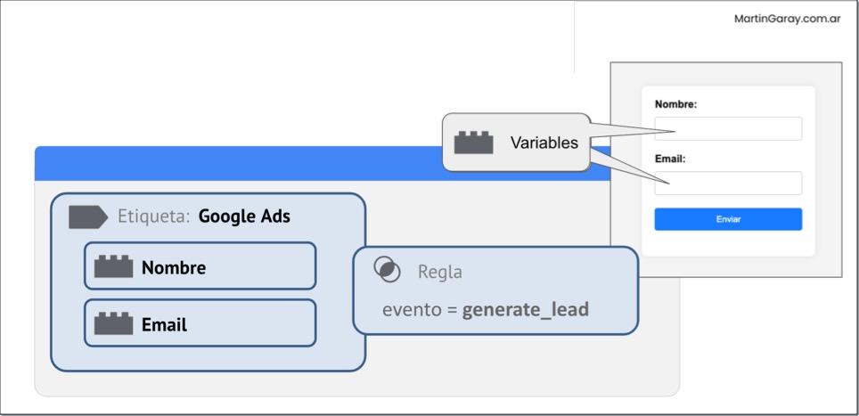 Para capturar y enviar esta información, el DataLayer puede configurarse para recoger los datos ingresados en un formulario, como el correo electrónico, y luego transmitirlos a las etiquetas de conversión configuradas en Google Tag Manager. Esto garantiza que los datos necesarios se envíen correctamente tanto a Google Ads como a Facebook, manteniendo la integridad y precisión de las conversiones en ambas plataformas.