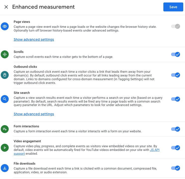 Estos son algunos de los eventos de medición mejorada disponibles en Google Analytics 4 (GA4). La implementación de estos eventos puede proporcionar una comprensión más profunda del comportamiento del usuario y ayudar a optimizar la experiencia del usuario en el sitio web o la aplicación.
